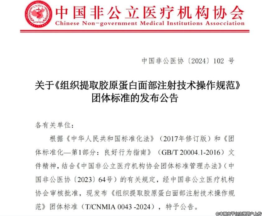 根據(jù)《中華人民共和國標準化法》(2017年修訂版)和《團體標準化—第1部分:良好行為指南》(GB/T 20004.1-2016)文件精神,結合《中國非公立醫(yī)療機構協(xié)會團體標準管理辦法》(中國非公醫(yī)協(xié)〔2023〕64號)的有關規(guī)定,經(jīng)中國非公立醫(yī)療機構協(xié)會審核批準,發(fā)布《組織提取膠原蛋白面部注射技術操作規(guī)范》團體標準(T/CNMIA 0043 -2024)(以下簡稱團標)。