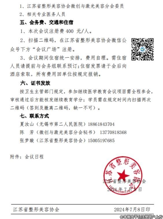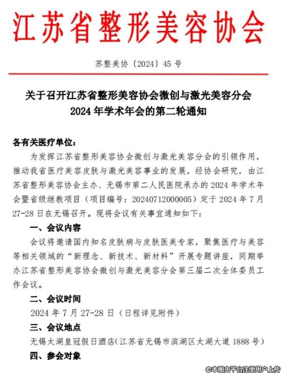 為發(fā)揮江蘇省整形美容協(xié)會(huì)微創(chuàng)與激光美容分會(huì)的引領(lǐng)作用,推動(dòng)我省醫(yī)療美容皮膚與激光美容事業(yè)的發(fā)展,經(jīng)協(xié)會(huì)研究,由江蘇省整形美容協(xié)會(huì)主辦、無錫市第二人民醫(yī)院承辦的 2024年學(xué)術(shù)年會(huì)暨省級(jí)繼教項(xiàng)目(項(xiàng)目編號(hào):20240712000005)定于2024年7月27-28日在無錫召開?,F(xiàn)將會(huì)議有關(guān)事宜通知如下:
