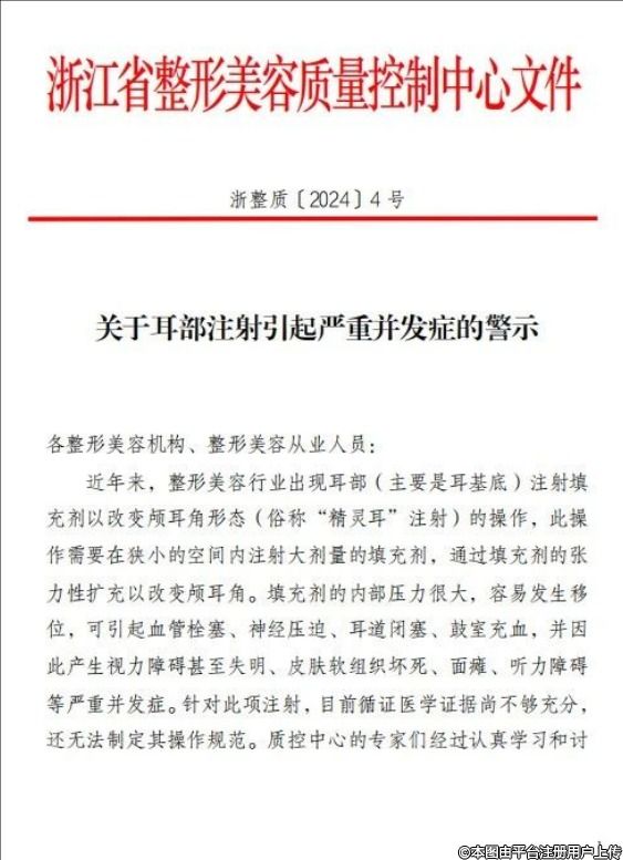 近期,我們注意到整形美容行業(yè)中出現(xiàn)了一種新的操作趨勢(shì),即通過在耳部(尤其是耳基底區(qū)域)注射填充劑來(lái)改變顱耳角的形態(tài),俗稱“精靈耳”注射。雖然這一操作旨在滿足部分消費(fèi)者對(duì)于特定耳部形態(tài)的追求,但其潛在的風(fēng)險(xiǎn)和并發(fā)癥不容忽視。請(qǐng)各位醫(yī)療美容從業(yè)人員務(wù)必高度重視以下文件浙整質(zhì)[2024]4號(hào),切實(shí)履行好自身的職責(zé)和義務(wù),保障患者的安全和健康。