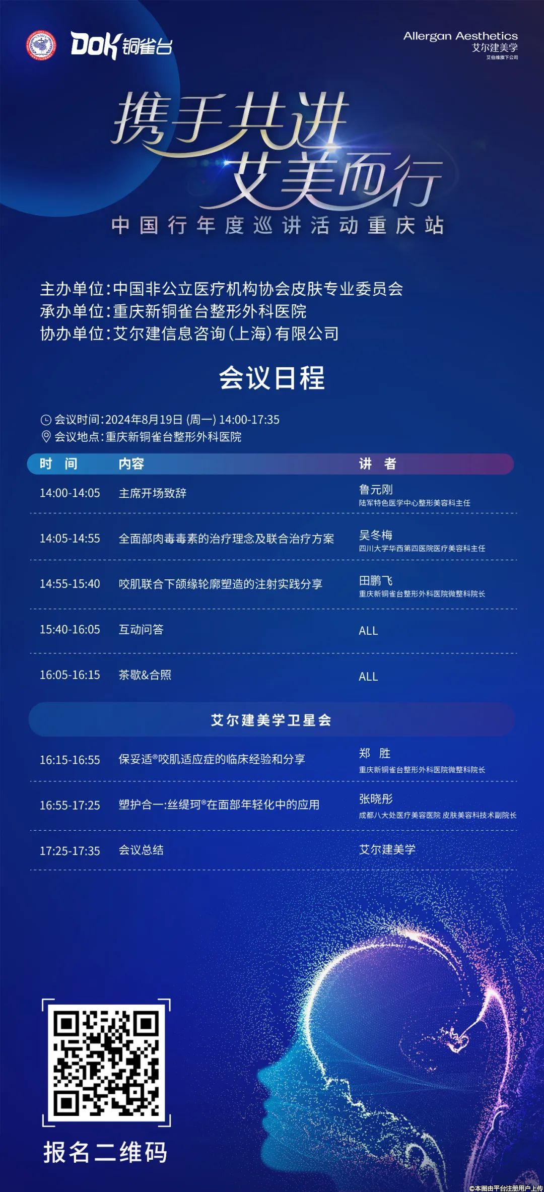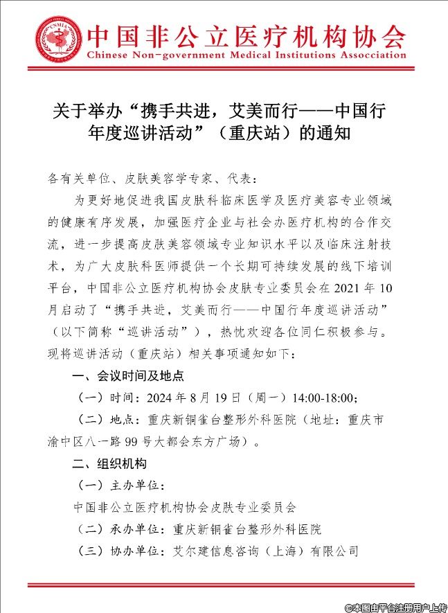 為更好地促進我國皮膚科臨床醫(yī)學(xué)及醫(yī)療美容專業(yè)領(lǐng)域的健康有序發(fā)展,加強醫(yī)療企業(yè)與社會辦醫(yī)療機構(gòu)的合作交流,進一步提高皮膚美容領(lǐng)域?qū)I(yè)知識水平以及臨床注射技術(shù),為廣大皮膚科醫(yī)師提供一個長期可持續(xù)發(fā)展的線下培訓(xùn)平臺,中國非公立醫(yī)療機構(gòu)協(xié)會皮膚專業(yè)委員會在2021年10月啟動了“攜手共進,艾美而行——中國行年度巡講活動”(以下簡稱“巡講活動”),熱忱歡迎各位同仁積極參與?,F(xiàn)將巡講活動(重慶站)相關(guān)事項通知如下: