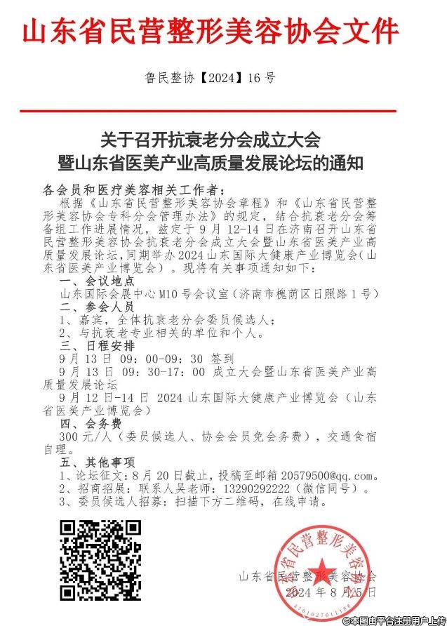 山東省民營(yíng)整形美容協(xié)會(huì)抗衰老分會(huì)成立大會(huì)暨山東省醫(yī)美產(chǎn)業(yè)高質(zhì)量發(fā)展論壇將于9月13日在濟(jì)南召開
