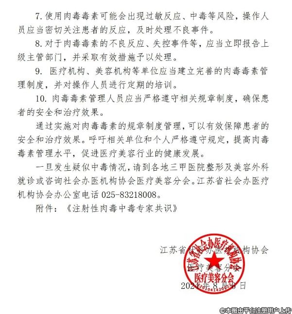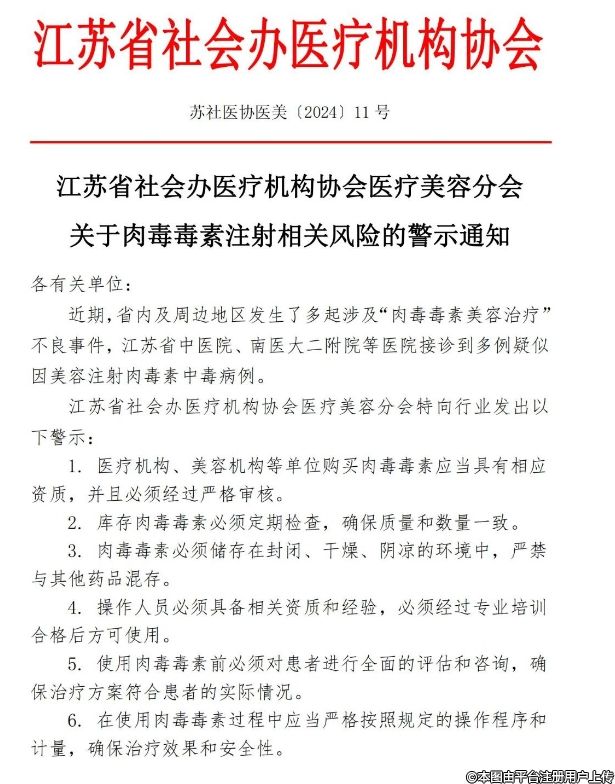 江蘇省社會(huì)辦醫(yī)療機(jī)構(gòu)協(xié)會(huì)醫(yī)療美容分會(huì)關(guān)于肉毒毒素注射相關(guān)風(fēng)險(xiǎn)的警示通知