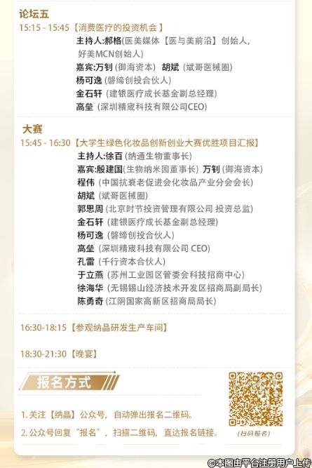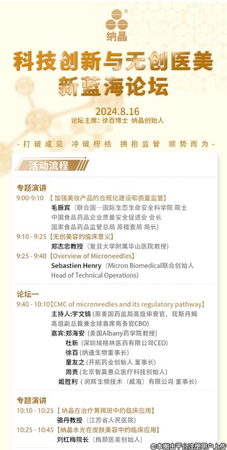 本次論壇匯聚了生物醫(yī)藥、醫(yī)療美容、美容護膚、政府監(jiān)管、大健康抗衰老、品牌營銷、消費醫(yī)療投資等領域的專家,旨在分享最新的行業(yè)洞見和技術創(chuàng)新,為您的機構提供安全、合法、有效的解決方案。通過真實案例分析,特別是納晶的成功實踐,幫助大家了解國家強監(jiān)管是美容產業(yè)科技創(chuàng)新最大的戰(zhàn)略機遇,并探討如何擁抱監(jiān)管,實現合法合規(guī)的長期盈利。