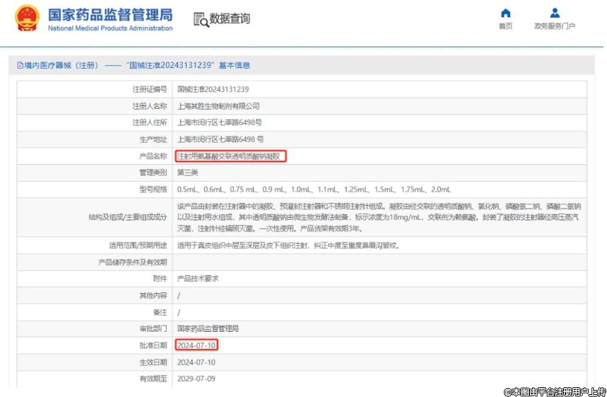 2024年7月10日,昊海生科旗下全資子公司上海其勝生物制劑有限公司申報(bào)的“注射用氨基酸交聯(lián)透明質(zhì)酸鈉凝膠”成功獲國(guó)家藥監(jiān)局批準(zhǔn),注冊(cè)證號(hào):國(guó)械注準(zhǔn)20243131239。據(jù)悉,本產(chǎn)品基于公司自主研發(fā)的全球首創(chuàng)有機(jī)交聯(lián)工藝,系國(guó)內(nèi)唯一一款使用天然產(chǎn)物賴氨酸作為交聯(lián)劑的玻尿酸產(chǎn)品。
