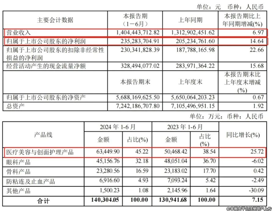 據(jù)悉,昊海生科已經(jīng)連續(xù)三年業(yè)績(jī)保持高增長(zhǎng),2022年?duì)I業(yè)收入21.3億元,同比增長(zhǎng)20.56%;2023年?duì)I業(yè)收入26.54億元,同比增長(zhǎng)24.59%。2024年上半年,昊海生科在醫(yī)療美容與創(chuàng)面護(hù)理板塊實(shí)現(xiàn)營(yíng)收6.34億元,同比增長(zhǎng)25.72%,占總營(yíng)收的45.22%,其中,玻尿酸營(yíng)收4.17億元,同比增長(zhǎng)51.3%,營(yíng)收占比65.76%。同時(shí),昊海生科擬向全體股東每10股派發(fā)現(xiàn)金紅利4.0元(含稅),利潤(rùn)分配不送紅股,不進(jìn)行資本公積金轉(zhuǎn)增股本,總計(jì)派發(fā)現(xiàn)金紅利9319萬(wàn)元。昊海生科作為一家應(yīng)用生物醫(yī)用材料技術(shù)和基因工程技術(shù)進(jìn)行醫(yī)療器械及藥品研發(fā)、生產(chǎn)和銷售的科技創(chuàng)新型企業(yè),昊海生科一直專注于醫(yī)用生物材料市場(chǎng)中四個(gè)快速增長(zhǎng)的細(xì)分領(lǐng)域,覆蓋眼科、醫(yī)美、骨科、外科。在醫(yī)美領(lǐng)域,昊海生科以玻尿酸為起點(diǎn),首先,依托公司的單相交聯(lián)、低溫二次交聯(lián)、線性無(wú)顆?;宦?lián)以及有機(jī)交聯(lián)等交聯(lián)工藝,自主研發(fā)出包括“海薇”、“姣蘭”及“海魅”在內(nèi)三款玻尿酸產(chǎn)品,建立公司皮膚填充產(chǎn)品線;其次,通過(guò)投資美國(guó)Recros Inc及收購(gòu)歐華美科,公司的產(chǎn)品線拓展至物理類皮膚旋切設(shè)備,激光、射頻類皮膚護(hù)理光電設(shè)備領(lǐng)域;同時(shí),通過(guò)投資美國(guó)Eirion公司,獲得了創(chuàng)新外用型/傳統(tǒng)注射型肉毒毒素產(chǎn)品以及白發(fā)脫發(fā)治療藥品未來(lái)在中國(guó)市場(chǎng)的商業(yè)化權(quán)利。截止目前,已形成“玻尿酸+肉毒素+光電設(shè)備”的醫(yī)美產(chǎn)業(yè)鏈布局。