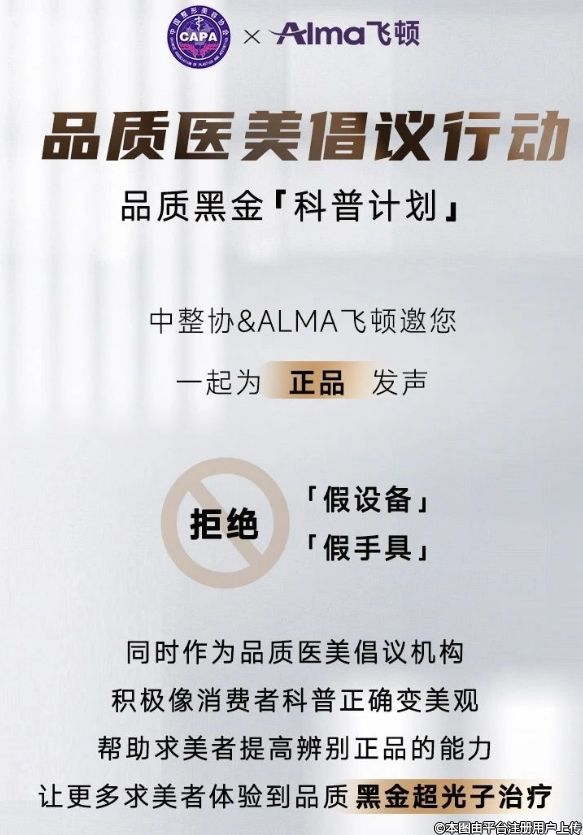 為了提高光子嫩膚臨床滿(mǎn)意度,交付黑金超光子更好臨床效果,中國(guó)整形美容協(xié)會(huì)聯(lián)合Alma飛頓共同發(fā)起品質(zhì)醫(yī)美倡議行動(dòng)【品質(zhì)黑金科普計(jì)劃】,我們誠(chéng)摯邀請(qǐng)您一起為正品發(fā)聲,拒絕使用假設(shè)備、假手具!