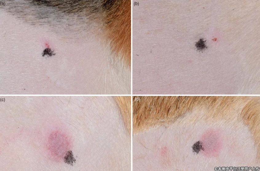 結(jié)果顯示,50%甘油鹽水注射在所有犬中誘導(dǎo)出明顯的紅斑和硬結(jié)。