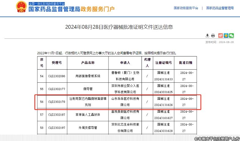 2024年8月27日,山東谷雨春旗下全資子公司山東采采醫(yī)療注冊(cè)的“注射用聚己內(nèi)酯微球面部填充劑”正式獲得國(guó)家藥監(jiān)局批準(zhǔn),注冊(cè)證號(hào):國(guó)械注準(zhǔn)20243131626,主要用于皮下組織注射填充,以糾正中重度鼻唇溝皺紋。