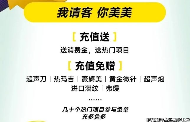 充值大膨脹,充的多送的越多。消費金、變美項目......還有幾十個項目參與免單,這福利也是沒誰了,簡直“壕”無人性。