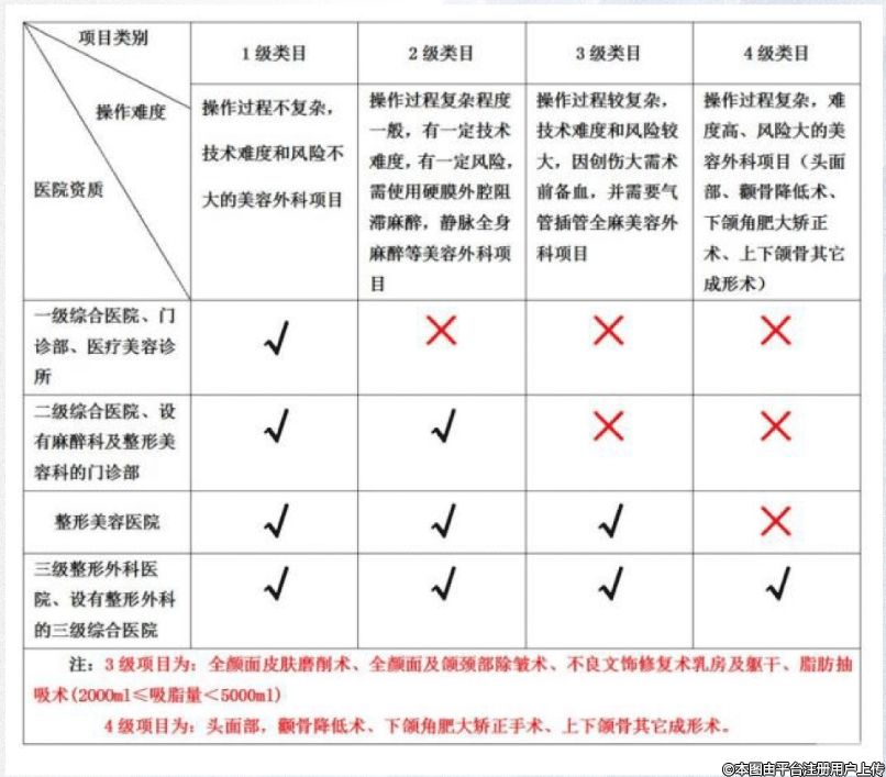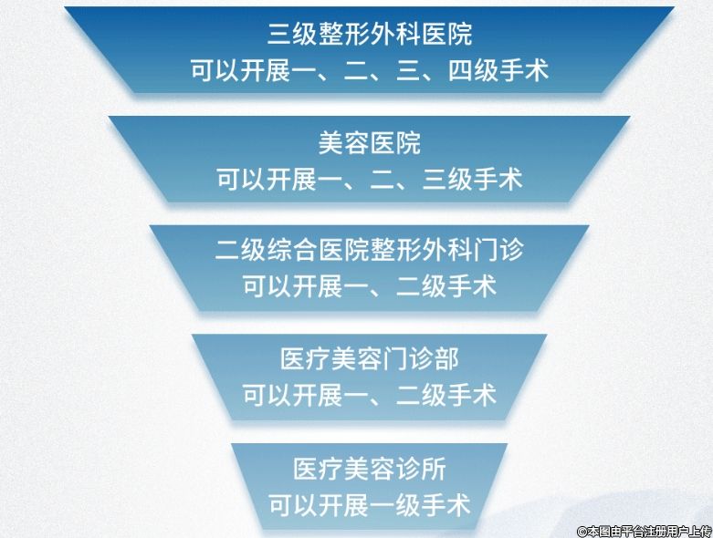即醫(yī)療美容診所、設(shè)有醫(yī)療美容科或整形外科的一級(jí)綜合醫(yī)院可開(kāi)展一級(jí)美容項(xiàng)目,設(shè)有麻醉科及醫(yī)療美容科或整形外科的門(mén)診部,或設(shè)有醫(yī)療美容科或整形外科的二級(jí)綜合醫(yī)院可開(kāi)展一、二級(jí)醫(yī)療美容項(xiàng)目;美容醫(yī)院可開(kāi)展一、二、三級(jí)醫(yī)療美容項(xiàng)目;三級(jí)整形外科醫(yī)院或設(shè)有整形外科或醫(yī)療美容科的三級(jí)綜合醫(yī)院可開(kāi)展二、三、四級(jí)整形美容項(xiàng)目,可開(kāi)展骨降低術(shù)、下頜角肥大矯正術(shù)、上下頜骨其他成形術(shù)等四級(jí)高難度手術(shù)。