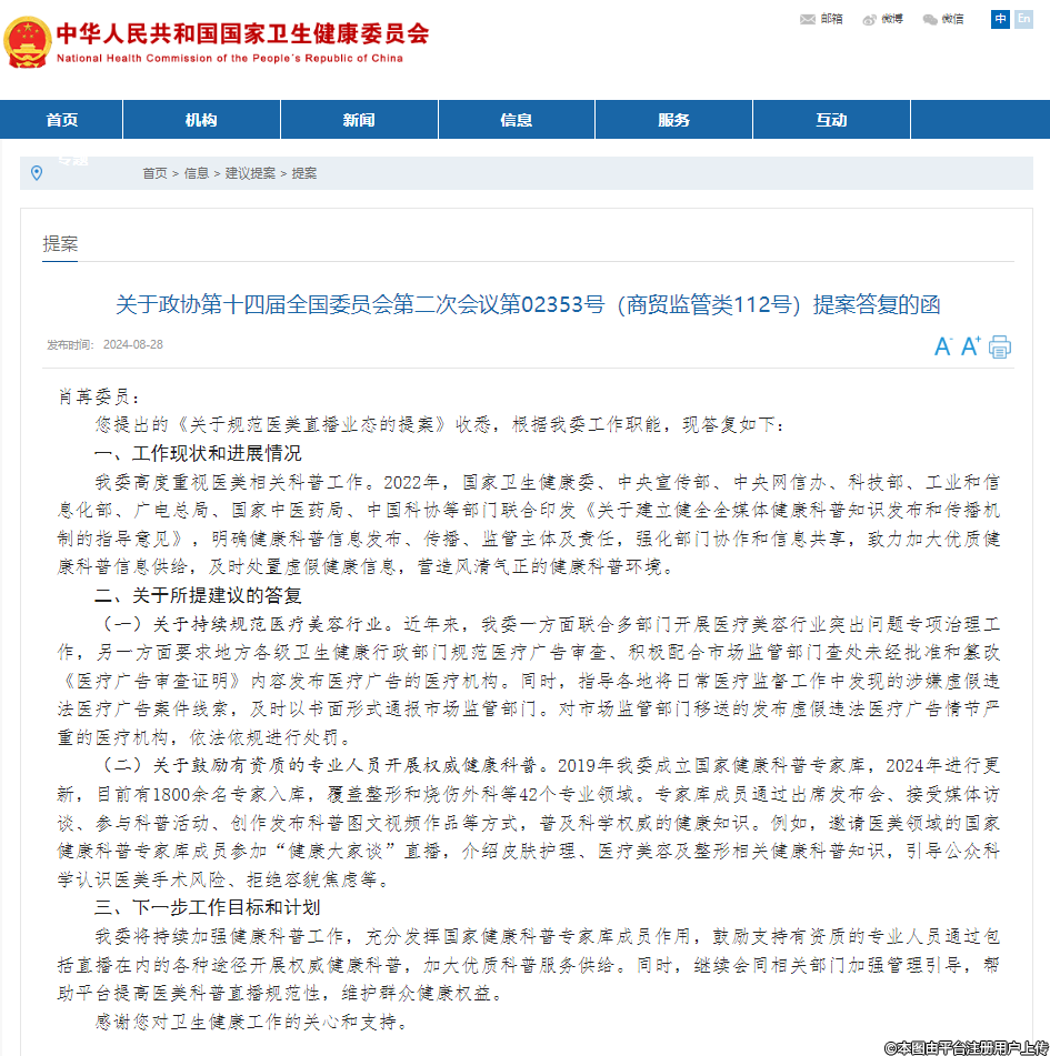 據(jù)國家衛(wèi)生健康委網(wǎng)站8月28日消息,對(duì)于全國政協(xié)委員肖苒《關(guān)于規(guī)范醫(yī)美直播業(yè)態(tài)的提案》,國家衛(wèi)健委從持續(xù)規(guī)范醫(yī)療美容行業(yè)、鼓勵(lì)有資質(zhì)的專業(yè)人員開展權(quán)威健康科普等方面予以答復(fù)。