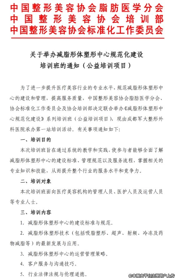 為了進一步提升醫(yī)療美容行業(yè)的專業(yè)水平,規(guī)范減脂形體塑形中心的建設和管理,提高服務質量,中國整形美容協(xié)會脂肪醫(yī)學分會協(xié)會標準化工作委員會及協(xié)會培訓部決定聯合舉辦《減脂形體塑形中心規(guī)范化建設》系列培訓班(公益培訓項目),現由成都軍大整形外科醫(yī)院承辦第一站培訓活動。有關事項通知如下: