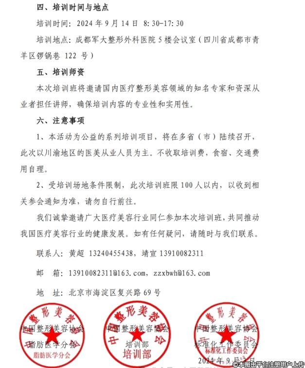 1、本活動為公益的系列培訓項目,將在多省(市)陸續(xù)召開此次以川渝地區(qū)的醫(yī)美從業(yè)人員為主。不收取培訓費,食宿、交通費用自理