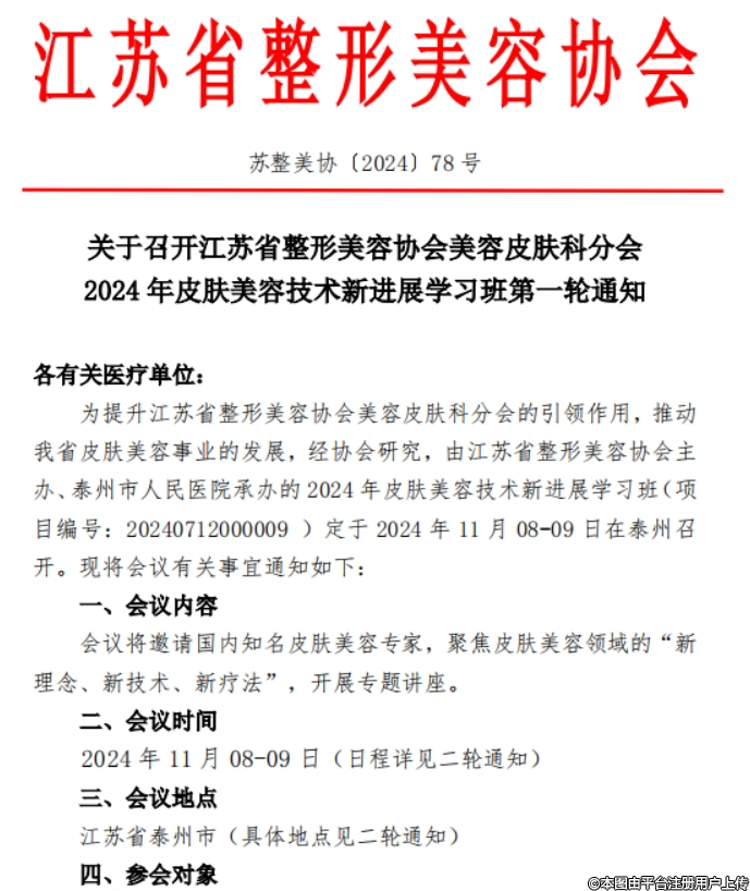 關(guān)于召開江蘇省整形美容協(xié)會(huì)美容皮膚科分會(huì)2024 年皮膚美容技術(shù)新進(jìn)展學(xué)習(xí)班第一輪通知