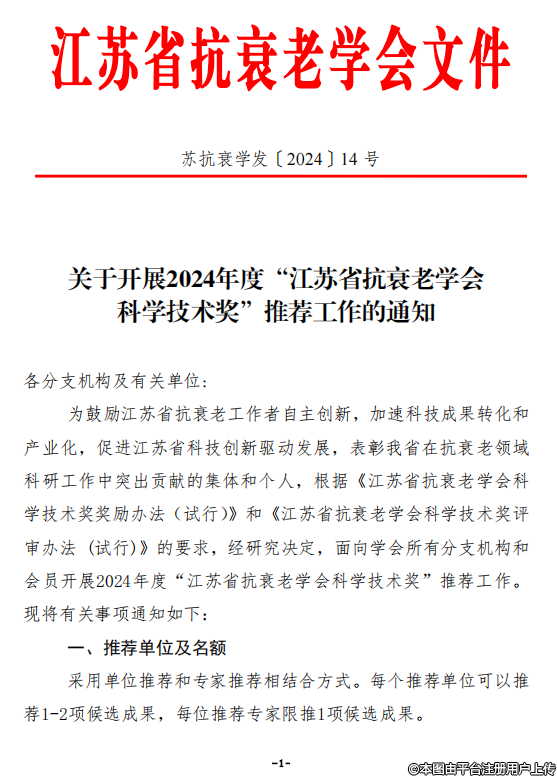 關(guān)于開展2024年度“江蘇省抗衰老學(xué)會科學(xué)技術(shù)獎”推薦工作的通知