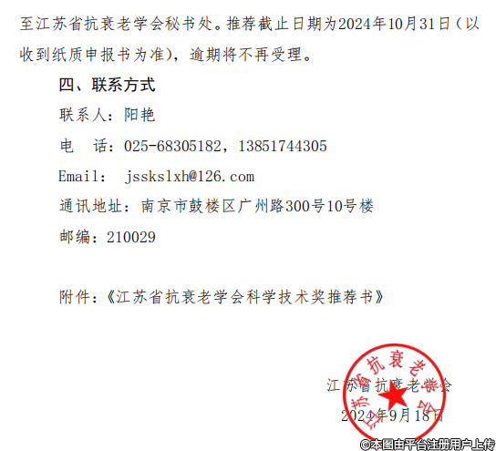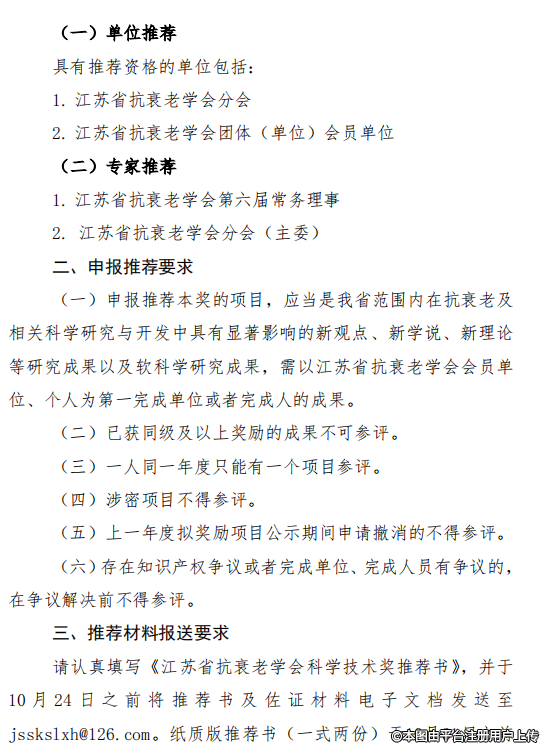 請認(rèn)真填寫《江蘇省抗衰老學(xué)會科學(xué)技術(shù)獎推薦書》,并于10月24日之前將推薦書及佐證材料電子文檔發(fā)送至jsskslxh@126.com。