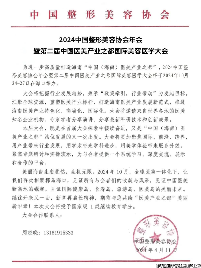為進一步高質(zhì)量打造海南“中國(海南)醫(yī)美產(chǎn)業(yè)之都”,2024中國整形美容協(xié)會年會暨第二屆中國醫(yī)美產(chǎn)業(yè)之都國際美容醫(yī)學大會將于2024年10月24-27日在??谂e辦。