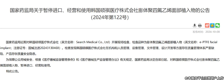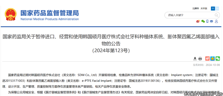 10月8日,國家藥監(jiān)局官網(wǎng)接連發(fā)布了兩個公告:《國家藥監(jiān)局關于暫停進口、經(jīng)營和使用韓國碩祺醫(yī)療株式會社膨體聚四氟乙烯面部植入物的公告(2024年第122號)》、《國家藥監(jiān)局關于暫停進口、經(jīng)營和使用韓國碩月醫(yī)療株式會社牙科種植體系統(tǒng)、膨體聚四氟乙烯面部植入物的公告(2024年第123號)》。