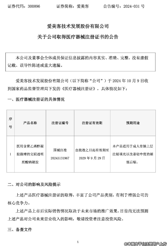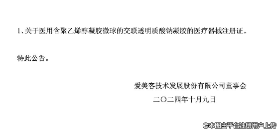 愛美客10月9日晚間發(fā)布公告稱,愛美客技術發(fā)展股份有限公司于2024年10月9日收到國家藥品監(jiān)督管理局下發(fā)的《醫(yī)療器械注冊證》。產品名稱為“醫(yī)用含聚乙烯醇凝膠微球的交聯(lián)透明質酸鈉凝膠”。