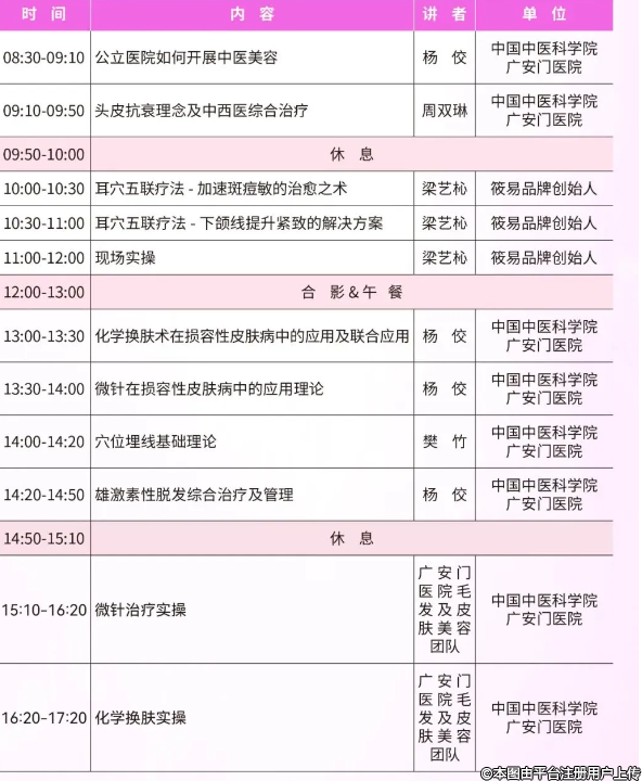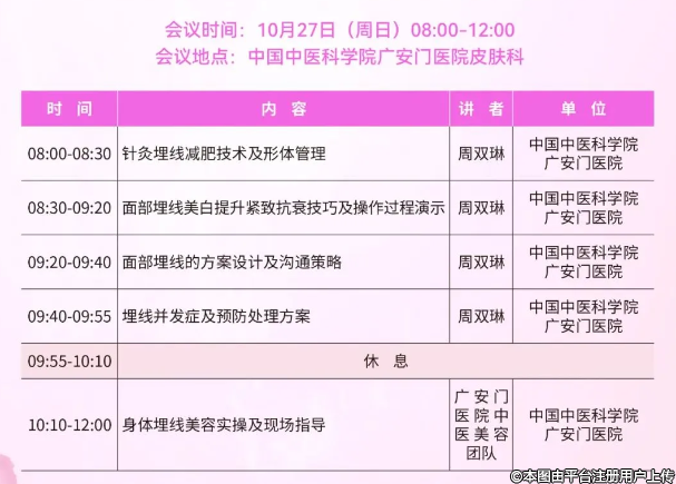 3、10月26-27日為學習班培訓課程,以授課及實操為主,內容包含中醫(yī)美容外治技術,穴位埋線技術,微針治療,化學換膚術,脫發(fā)非藥物治療等,配置 6-7 名輔導老師,做到每個學員親自實操,培訓結束后頒發(fā)中國整形美容協會培訓證書。