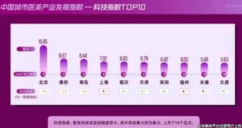 在 50 座城市中,嘉興由上期的 48 位上升到本期的 34 位,變動(dòng)幅度最大。北京作為全國(guó)科技創(chuàng)新中心,在醫(yī)美科技領(lǐng)域始終保持領(lǐng)先地位。各城市應(yīng)加大對(duì)醫(yī)美科技的研發(fā)投入,提升自主創(chuàng)新能力,推動(dòng)醫(yī)美產(chǎn)業(yè)向高端化、智能化方向發(fā)展。