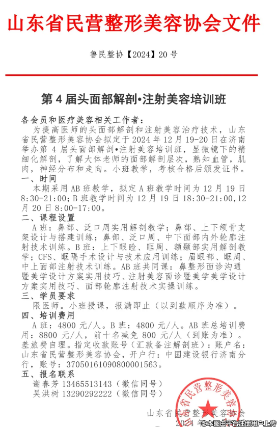 為提高醫(yī)師的頭面部解剖和注射美容治療技術(shù),山東省民營整形美容協(xié)會擬定于2024年12月19-20日在濟南舉辦第4屆頭面部解剖·注射美容培訓班,顯微鏡下的精細化解剖,了解大體老師的面部解剖層次,熟知血管,肌肉,神經(jīng)分布和走向。小班教學,考核合格后頒發(fā)證書。