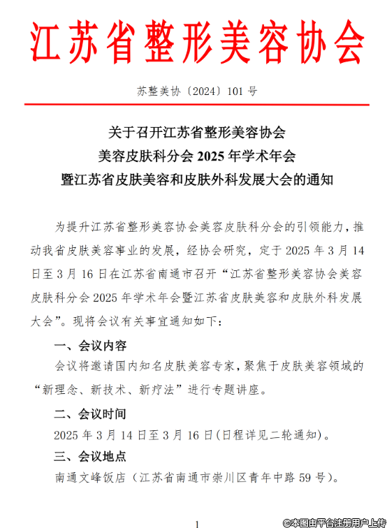 關(guān)于召開江蘇省整形美容協(xié)會(huì)美容皮膚科分會(huì) 2025 年學(xué)術(shù)年會(huì)暨江蘇省皮膚美容和皮膚外科發(fā)展大會(huì)的通知