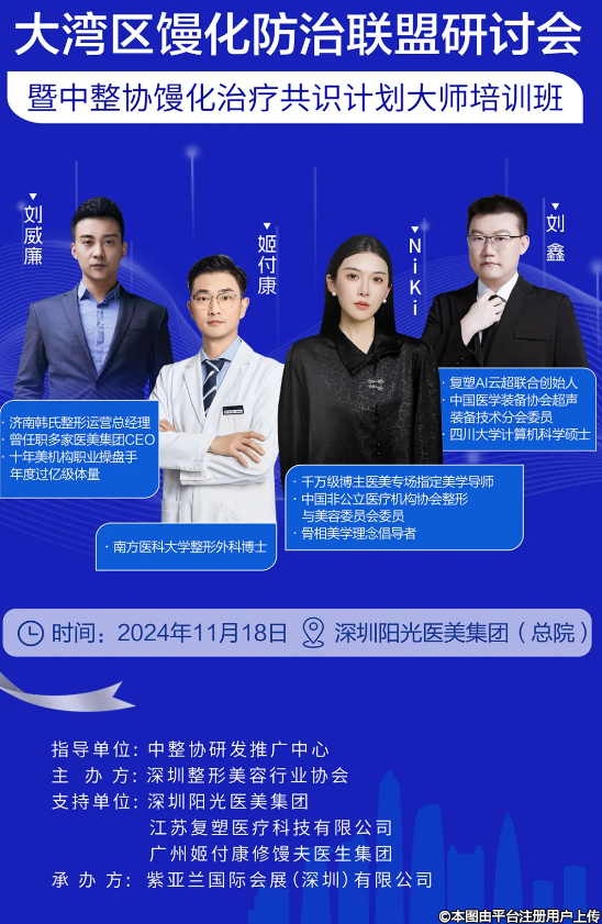 因此,由中整協(xié)研發(fā)推廣中心指導,深圳整形美容行業(yè)協(xié)會主辦,深圳陽光醫(yī)美集團、江蘇復塑醫(yī)療科技有限公司、廣州姬付康修饅夫醫(yī)生集團支持,紫亞蘭國際會展(深圳)有限公司承辦的“大灣區(qū)饅化防治聯(lián)盟研討會暨中整協(xié)饅化治療共識計劃大師培訓班”,將深入探討“饅化”的成因、影響與解決方案。
