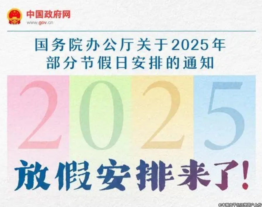 國務院辦公廳印發(fā)《關于2025年部分節(jié)假日安排的通知》,哪天放假、怎么調休?中國政府網帶你一圖看懂。