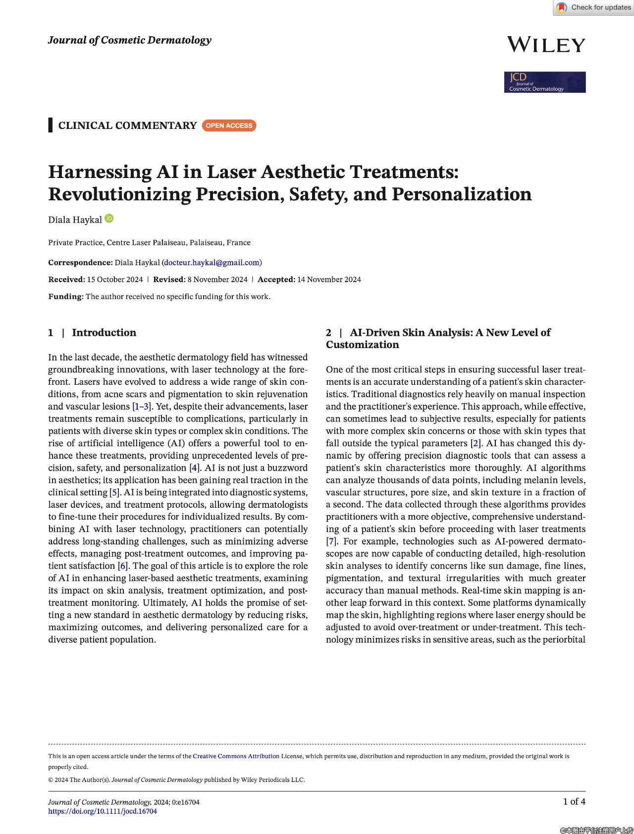 過去十年間,美容皮膚科領(lǐng)域因激光技術(shù)的創(chuàng)新而發(fā)生了顯著變革,激光技術(shù)始終處于該領(lǐng)域發(fā)展的前沿。激光已逐漸發(fā)展成為一種能夠有效治療多種皮膚狀況的手段,其應(yīng)用范圍涵蓋了從痤瘡疤痕、色素沉著到皮膚年輕化以及血管病變等諸多方面。雖然激光技術(shù)取得了長足的進(jìn)步,但在實際應(yīng)用中,激光治療并非毫無風(fēng)險,尤其是在面對皮膚類型各異或者皮膚狀況較為復(fù)雜的患者時,仍然容易出現(xiàn)各種并發(fā)癥。人工智能(AI)技術(shù)的興起,為改善激光治療效果提供了一種極具潛力的強(qiáng)大工具。AI 技術(shù)的應(yīng)用能夠在激光治療過程中提供前所未有的高精度、高安全性以及高度個體化的治療方案。如今在醫(yī)美領(lǐng)域,人工智能已經(jīng)不再只是一個熱門的流行詞匯,其在臨床實踐中的應(yīng)用正逐漸獲得實質(zhì)性的進(jìn)展和廣泛的認(rèn)可。目前,人工智能技術(shù)正在逐步融入到診斷系統(tǒng)、激光設(shè)備以及治療方案等各個環(huán)節(jié)之中,這使得醫(yī)生能夠更加精細(xì)地調(diào)整治療程序,為每一位患者提供更加個體化的治療結(jié)果。將人工智能技術(shù)與激光技術(shù)結(jié)合,有望克服激光治療長期面臨的諸多挑戰(zhàn),例如如何最大程度地減少治療過程中的不良反應(yīng)、如何更加有效地管理治療后的效果以及如何顯著提高患者對治療的滿意度等。本文旨在深入探討人工智能技術(shù)在提升激光美容治療效果方面可能發(fā)揮的重要作用,詳細(xì)論述其對皮膚分析、治療優(yōu)化以及治療后監(jiān)測等環(huán)節(jié)的深遠(yuǎn)影響。人工智能技術(shù)有望通過降低治療風(fēng)險、最大化治療效果以及為不同患者群體提供更加個性化的護(hù)理服務(wù),在美容皮膚治療領(lǐng)域樹立全新標(biāo)準(zhǔn)。