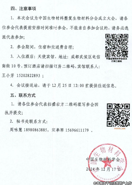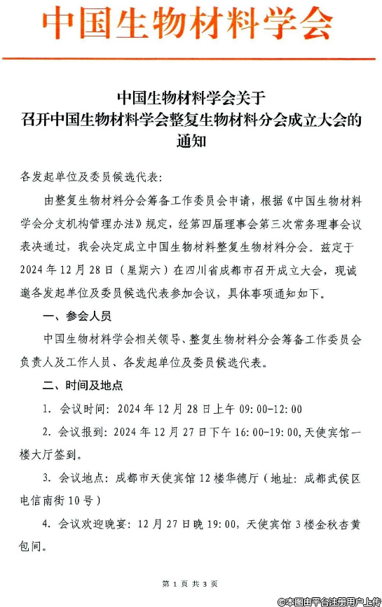 由整復生物材料分會籌備工作委員會申請,根據(jù)《中國生物材料學會分支機構管理辦法》規(guī)定,經第四屆理事會第三次常務理事會議表決通過,我會決定成立中國生物材料整復生物材料分會。茲定于2024年12月28日(星期六)在四川省成都市召開成立大會,現(xiàn)誠邀各發(fā)起單位及委員候選代表參加會議,具體事項通知如下,