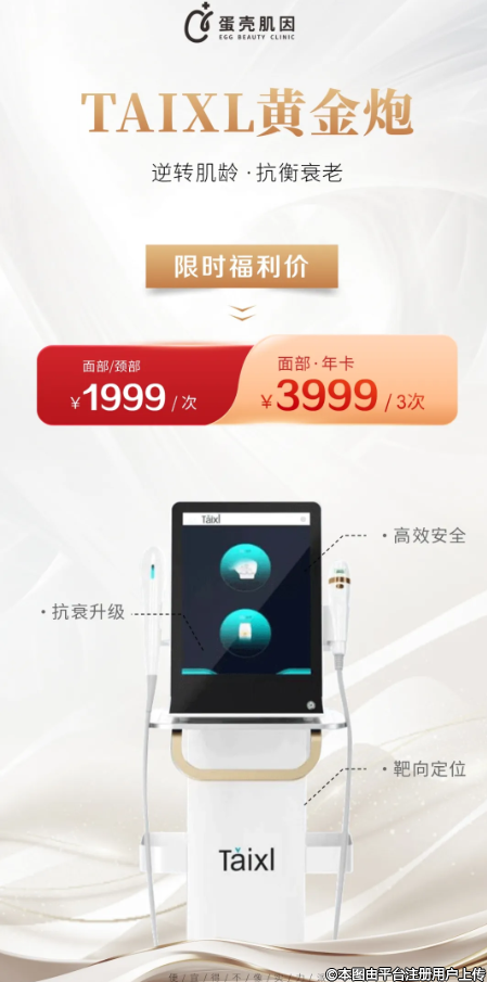 福利價一樣安排上!Taixl黃金炮面部/頸部單次體驗價僅需1999元,更有3999元的面部年卡(3次),折算下來一次僅需1333元!