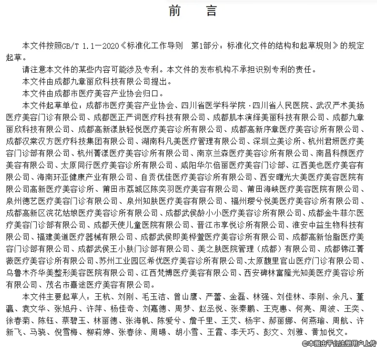 該規(guī)范由成都九章麗欣科技有限公司提出,成都市醫(yī)療美容產(chǎn)業(yè)協(xié)會(huì)歸口,并聯(lián)合四川省醫(yī)學(xué)科學(xué)院·四川省人民醫(yī)院、武漢嚴(yán)術(shù)美揚(yáng)醫(yī)療美容門(mén)診有限公司、成都醫(yī)正嚴(yán)詞醫(yī)療科技有限公司、成都肌本演繹美麗科技有限公司、成都九章麗欣科技有限公司、成都高新漾膚輕悅醫(yī)療美容診所有限公司、成都高新序章醫(yī)療美容診所有限公司等多家單位共同起草。其起草過(guò)程嚴(yán)格遵循 GB/T 1.1—2020《標(biāo)準(zhǔn)化工作導(dǎo)則 第 1 部分:標(biāo)準(zhǔn)化文件的結(jié)構(gòu)和起草規(guī)則》的規(guī)定,凝聚了眾多業(yè)內(nèi)權(quán)威專(zhuān)家的專(zhuān)業(yè)智慧與豐富經(jīng)驗(yàn),全面涵蓋了術(shù)后修復(fù)等全流程的細(xì)致準(zhǔn)則。