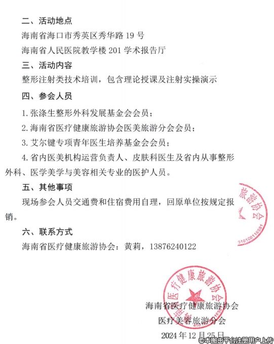 擬定于2025年1月11日(周六)在海口舉辦由張滌生整形外科發(fā)展基金會主辦,艾爾鍵專項青年醫(yī)生培養(yǎng)基金會協辦海南省人民醫(yī)院、海南省醫(yī)療健康旅游協會醫(yī)療美容分會承辦的"天涯美麗行”系列學術活動第十一站,現將活動有關事項通知如下: