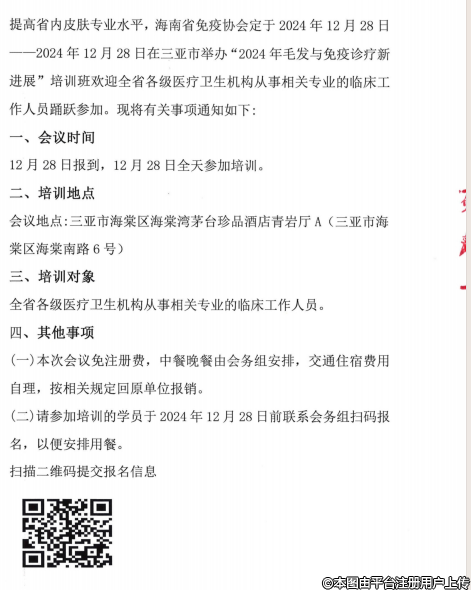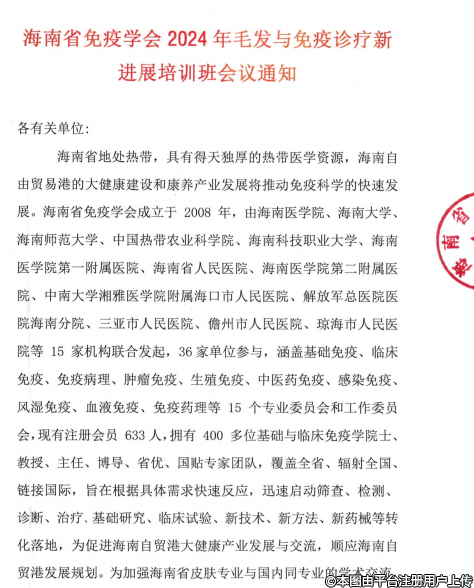 海南省免疫學(xué)會(huì) 2024 年毛發(fā)與免疫診療新進(jìn)展培訓(xùn)班會(huì)議通知