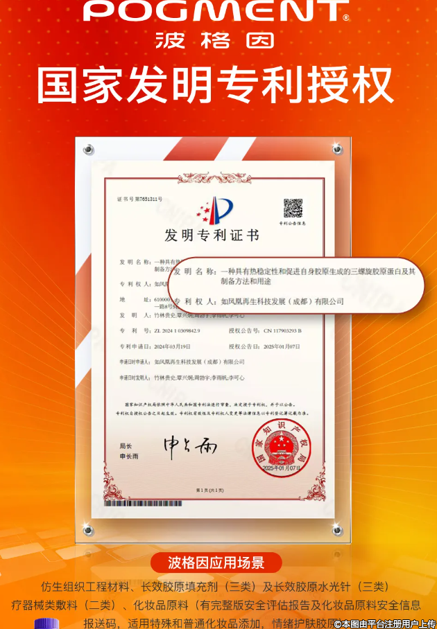 近日,如鳳凰再生科技公司喜迎開年佳訊,其自主研發(fā)的“POGMENT波格因三螺旋仿生膠原蛋白”榮獲國家發(fā)明專利授權!這一革命性技術通過獨創(chuàng)的“三螺旋仿生結構”,成功破解長久以來困擾行業(yè)的力學性能和生物活性難題,成為膠原蛋白領域的又一重要里程碑。