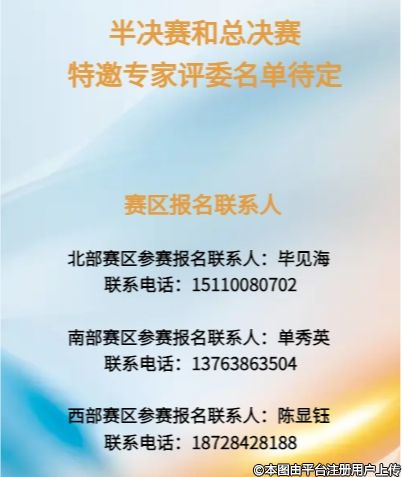 所有參賽單位和個(gè)人上報(bào)材料,將由大會(huì)學(xué)術(shù)秘書處進(jìn)行初步篩選審核,初篩后由專家進(jìn)行評(píng)分,最后評(píng)選出每個(gè)半決賽區(qū)前15名單位和個(gè)人進(jìn)入半決賽。