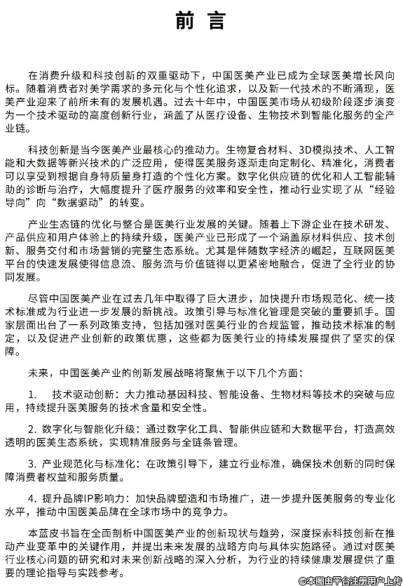 本藍皮書旨在全面剖析中國醫(yī)美產業(yè)的創(chuàng)新現(xiàn)狀與趨勢,深度探索科技創(chuàng)新在推動產業(yè)變革中的關鍵作用,并提出未來發(fā)展的戰(zhàn)略方向與具體實施路徑。通過對醫(yī)美行業(yè)核心問題的研究和對未來創(chuàng)新戰(zhàn)略的深入分析,為行業(yè)的持續(xù)健康發(fā)展提供了重要的理論指導與實踐參考。