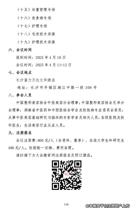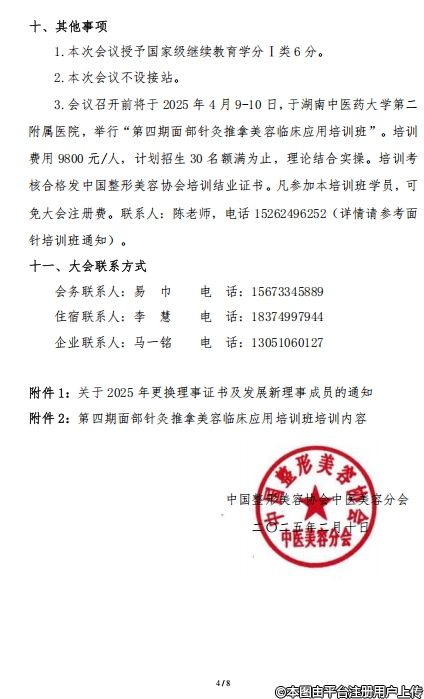 3.會議召開前將于2025年4月9-10日,于湖南中醫(yī)藥大學(xué)第二附屬醫(yī)院,舉行“第四期面部針灸推拿美容臨床應(yīng)用培訓(xùn)班”。培訓(xùn)費用9800元/人,計劃招生30名額滿為止,理論結(jié)合實操。培訓(xùn)考核合格發(fā)中國整形美容協(xié)會培訓(xùn)結(jié)業(yè)證書。凡參加本培訓(xùn)班學(xué)員,可免大會注冊費。