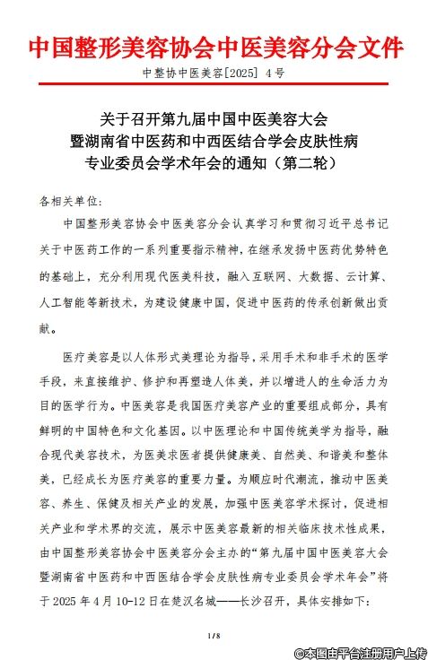 醫(yī)療美容是以人體形式美理論為指導(dǎo),采用手術(shù)和非手術(shù)的醫(yī)學(xué)手段,來直接維護、修護和再塑造人體美,并以增進人的生命活力為目的醫(yī)學(xué)行為。中醫(yī)美容是我國醫(yī)療美容產(chǎn)業(yè)的重要組成部分,具有鮮明的中國特色和文化基因。以中醫(yī)理論和中國傳統(tǒng)美學(xué)為指導(dǎo),融合現(xiàn)代美容技術(shù),為醫(yī)美求醫(yī)者提供健康美、自然美、和諧美和整體美,已經(jīng)成長為醫(yī)療美容的重要力量。為順應(yīng)時代潮流,推動中醫(yī)美容、養(yǎng)生、保健及相關(guān)產(chǎn)業(yè)的發(fā)展,加強中醫(yī)美容學(xué)術(shù)探討,促進相關(guān)產(chǎn)業(yè)和學(xué)術(shù)界的交流,展示中醫(yī)美容最新的相關(guān)臨床技術(shù)性成果,由中國整形美容協(xié)會中醫(yī)美容分會主辦的“第九屆中國中醫(yī)美容大會暨湖南省中醫(yī)藥和中西醫(yī)結(jié)合學(xué)會皮膚性病專業(yè)委員會學(xué)術(shù)年會”將于2025年4月10-12日在楚漢名城——長沙召開,具體安排如下: