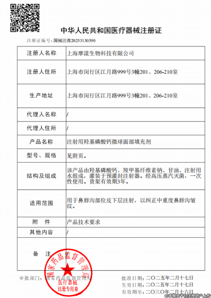 2月17日,上海摩漾生物科技有限公司“注射用羥基磷酸鈣微球面部填充劑”獲國家藥品監(jiān)督管理局頒發(fā)的醫(yī)療器械注冊證,注冊編號:國械注準(zhǔn)20253130390,適應(yīng)癥用于鼻唇溝部位皮下層注射,以糾正中重度鼻唇溝皺紋。
