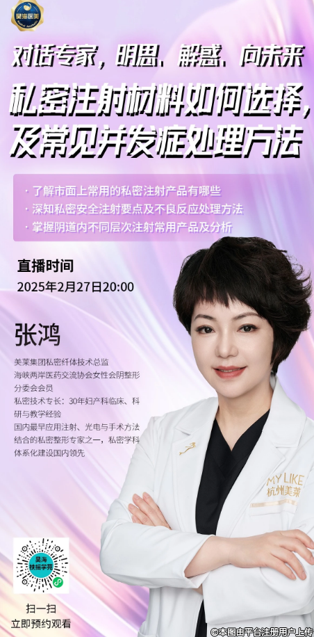 本次直播特邀張鴻教授帶來私密注射常見的注射材料及其特點和不良反應處理辦法。深度探討如何避免陰道注射引起的嚴重并發(fā)癥。進一步研究私密注射材料治療生殖器整形和保養(yǎng)的方法,并規(guī)范操作,使更多的求美者受益。