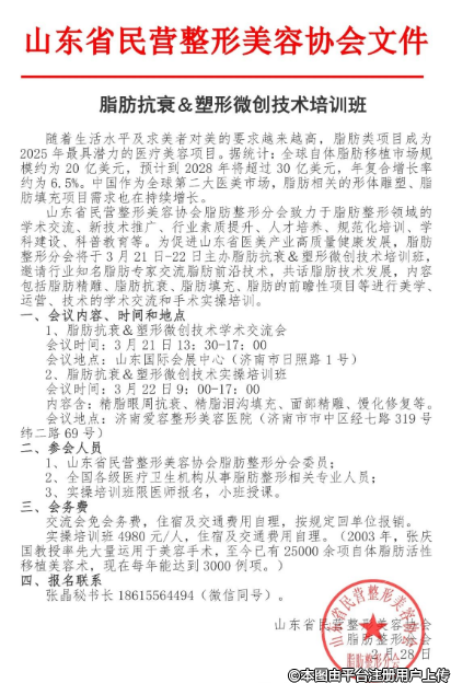 山東省民營整形美容協(xié)會脂肪整形分會致力于脂肪整形領(lǐng)域的學(xué)術(shù)交流、新技術(shù)推廣、行業(yè)素質(zhì)提升、人才培養(yǎng)、規(guī)范化培訓(xùn)、學(xué)科建設(shè)、科普教育等。為促進(jìn)山東省醫(yī)美產(chǎn)業(yè)高質(zhì)量健康發(fā)展,脂肪整形分會將于3月21日-22日主辦脂肪抗衰&塑形微創(chuàng)技術(shù)培訓(xùn)班,邀請行業(yè)知名脂肪專家交流脂肪前沿技術(shù),共話脂肪技術(shù)發(fā)展,內(nèi)容包括脂肪精雕、脂肪抗衰、脂肪填充、脂肪的前瞻性項目等進(jìn)行美學(xué)運營、技術(shù)的學(xué)術(shù)交流和手術(shù)實操培訓(xùn)。