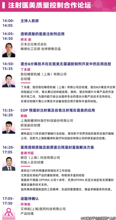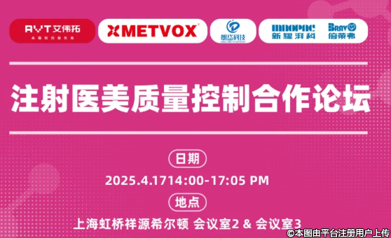 此次注射醫(yī)美質(zhì)量控制合作論壇,由艾偉拓(上海)醫(yī)藥科技有限公司攜手上海新耀湃科醫(yī)療科技股份有限公司、朗岱(上海)科技有限公司、勃拉精密機(jī)械(上海)有限公司聯(lián)合舉辦,將于4 月 17 日下午 2:00 準(zhǔn)時(shí)開(kāi)啟。