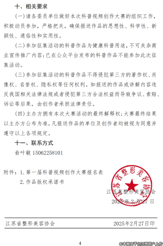 為貫徹落實《中華人民共和國科學(xué)技術(shù)普及法》《全民科學(xué)素質(zhì)行動規(guī)劃綱要(2021-2035年)》《關(guān)于新時代進(jìn)一步加強(qiáng)科學(xué)技術(shù)普及工作的意見》,動員和激勵整形美容護(hù)理人員參與科普創(chuàng)作,促進(jìn)及推動整形美容領(lǐng)域知識的傳播和普及,提升公眾對整形美容的科學(xué)認(rèn)知,引領(lǐng)整形美容行業(yè)的正向發(fā)展,江蘇省整形美容協(xié)會、江蘇省整形美容協(xié)會護(hù)理分會共同舉辦以“美麗有道,科普同行”為主題的江蘇省整形美容協(xié)會護(hù)理分會第一屆科普視頻創(chuàng)作大賽,現(xiàn)將有關(guān)事項通知如下: