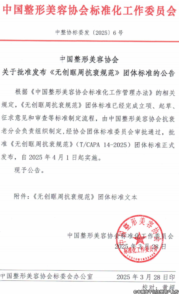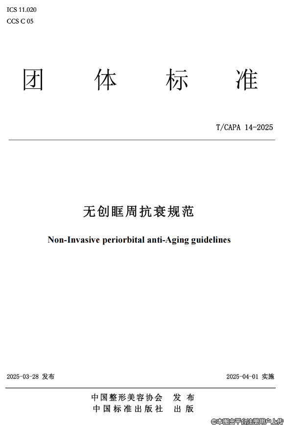 根據(jù)《中國整形美容協(xié)會標(biāo)準(zhǔn)化工作管理辦法》的相關(guān)規(guī)定,《無創(chuàng)眶周抗衰規(guī)范》團體標(biāo)準(zhǔn)已經(jīng)完成立項、起草、征求意見和審查等標(biāo)準(zhǔn)制定流程,由中國整形美容協(xié)會抗衰老分會負(fù)責(zé)組織制定,經(jīng)協(xié)會團體標(biāo)準(zhǔn)委員會審批通過,批準(zhǔn)《無創(chuàng)眶周抗衰規(guī)范》(T/CAPA 14-2025)團體標(biāo)準(zhǔn)正式發(fā)布,自2025年4月1日起實施。