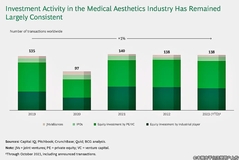 行業(yè)參與者的股權(quán)投資:醫(yī)美公司也進行戰(zhàn)略性股權(quán)投資,收購其他公司的股份,以實現(xiàn)產(chǎn)品組合的多元化并創(chuàng)造協(xié)同效應(yīng)。例如,生產(chǎn)填充劑的生物再生醫(yī)學公司 CG Bio 最近收購了面部埋線制造商 M.Base,以實現(xiàn)其產(chǎn)品組合的多元化。