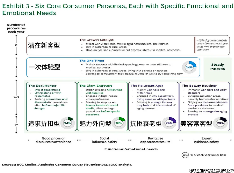 ?、?日常美容型(The Beauty Routiner):這些消費者年齡較大,通常是 X 世代和嬰兒潮一代,大多住在郊區(qū),接受持續(xù)的抗衰老治療,依賴醫(yī)美服務(wù)提供商的專業(yè)建議。這個群體最常見的項目包括神經(jīng)毒素和填充劑,主要功能需求是安全性。消費人群占比:20%。