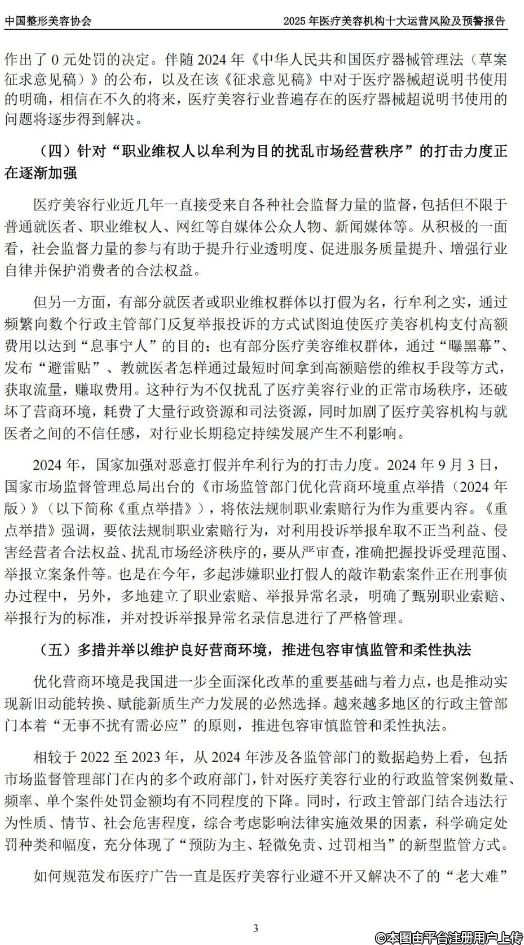 為了幫助醫(yī)療美容機構(gòu)在復雜多變的經(jīng)濟環(huán)境下可以穩(wěn)健前行,中國整形美容協(xié)會政策研究室曾于2024 年1 月15 日,組織行業(yè)資深專家、學者、律師,針對2023 年醫(yī)療美容機構(gòu)經(jīng)營管理現(xiàn)狀、日常運營主要風險及十大風險預警進行了系統(tǒng)分析和整理并形成《2024 年醫(yī)療美容機構(gòu)十大運營風險及預警報告》。 該報告具有較高準確性和實用性,對醫(yī)療美容行業(yè)在2024年具有重要指導意義,不僅為機構(gòu)提供了風險預警和合規(guī)建議,還推動了行業(yè)的自律和規(guī)范化發(fā)展。