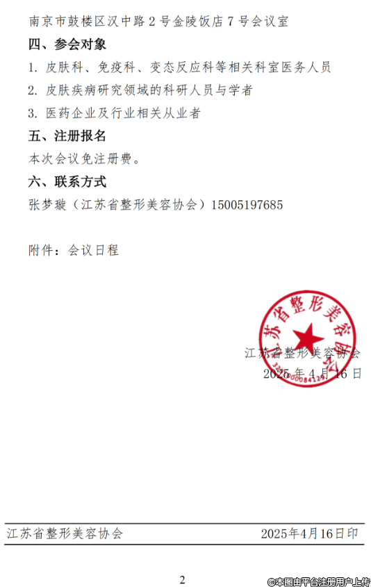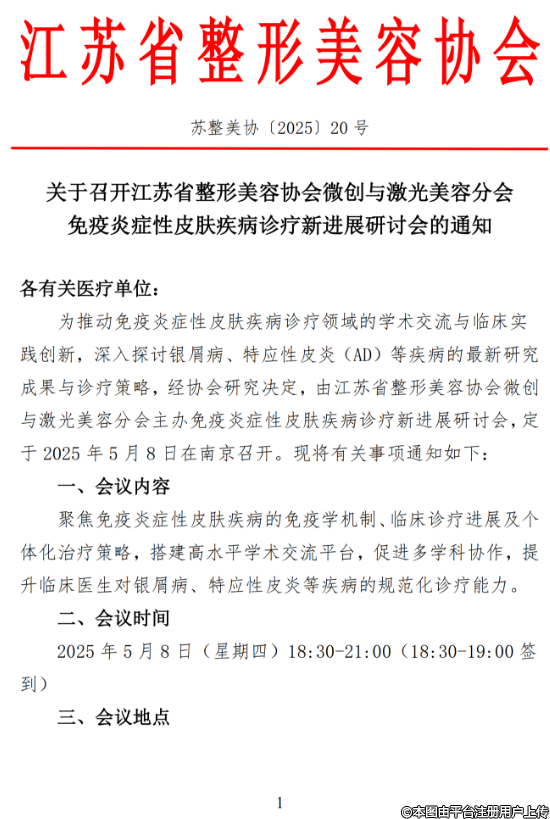 關于召開江蘇省整形美容協(xié)會微創(chuàng)與激光美容分會免疫炎癥性皮膚疾病診療新進展研討會的通知